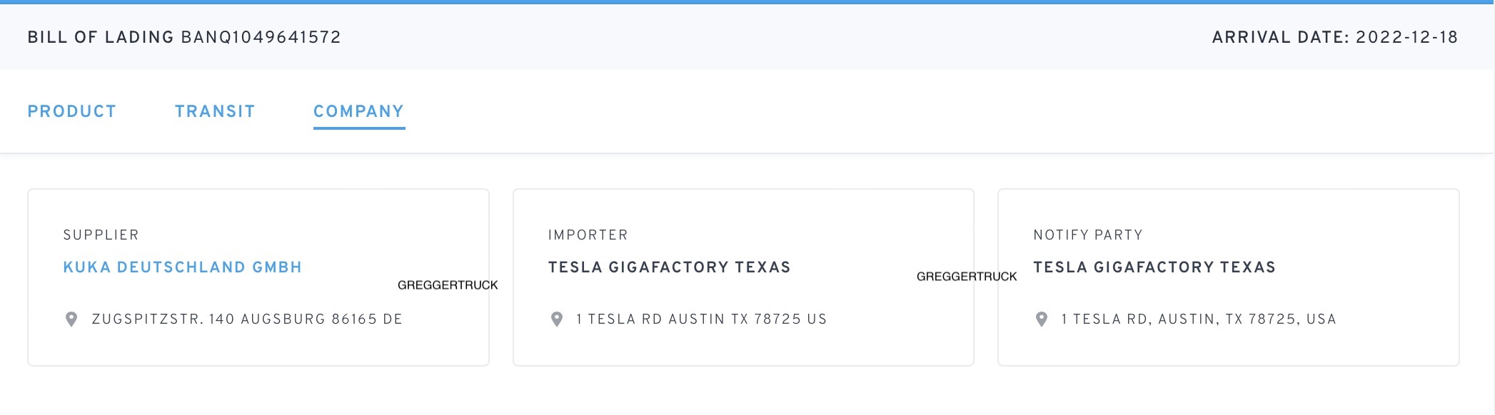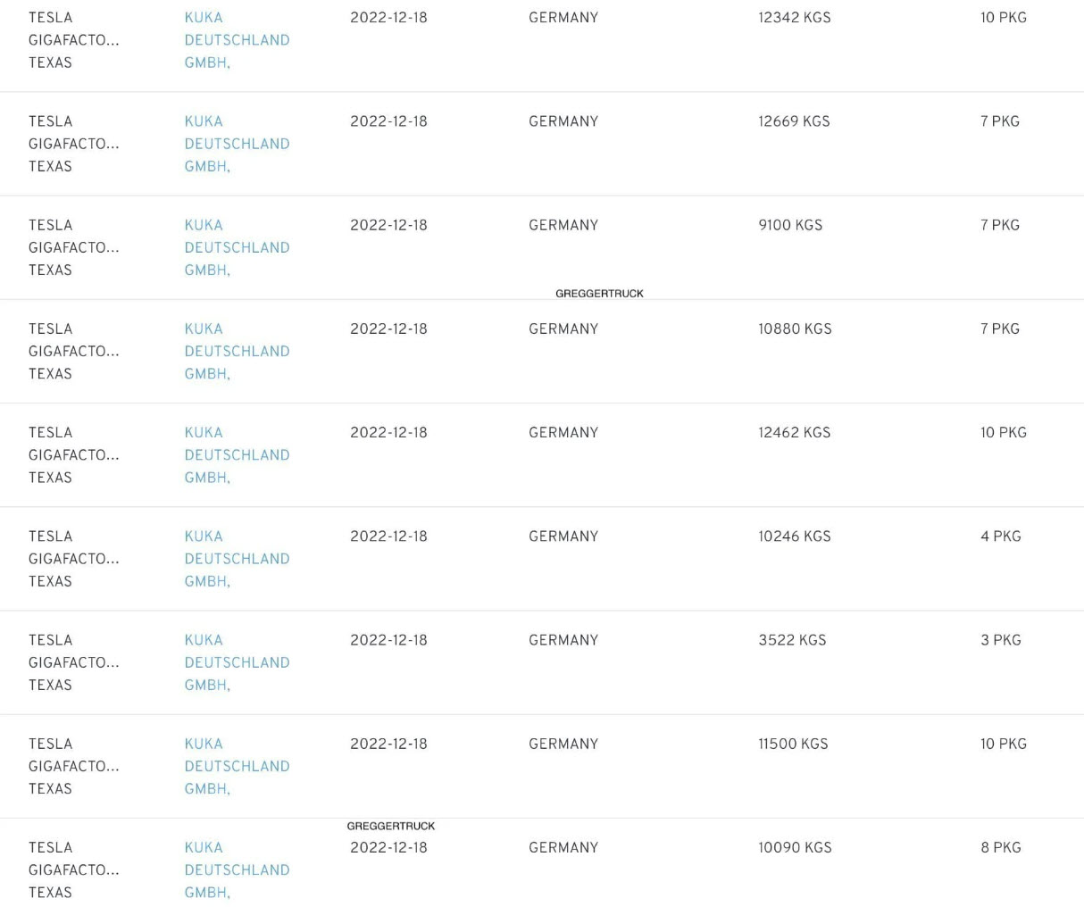 De acuerdo con la política de aterrizaje que Greggertruck compartió en Twitter (@Pío), los robots Kuka se enviaron desde Alemania en 9 envíos diferentes. Cada envío pesa de 3522 kg a 12669 kg (7764 lb a 27930 lb) con 3 a 10 robots en cada uno. La factura de aterrizaje muestra que llegaron a Giga Texas el 18 de diciembre de 2022.