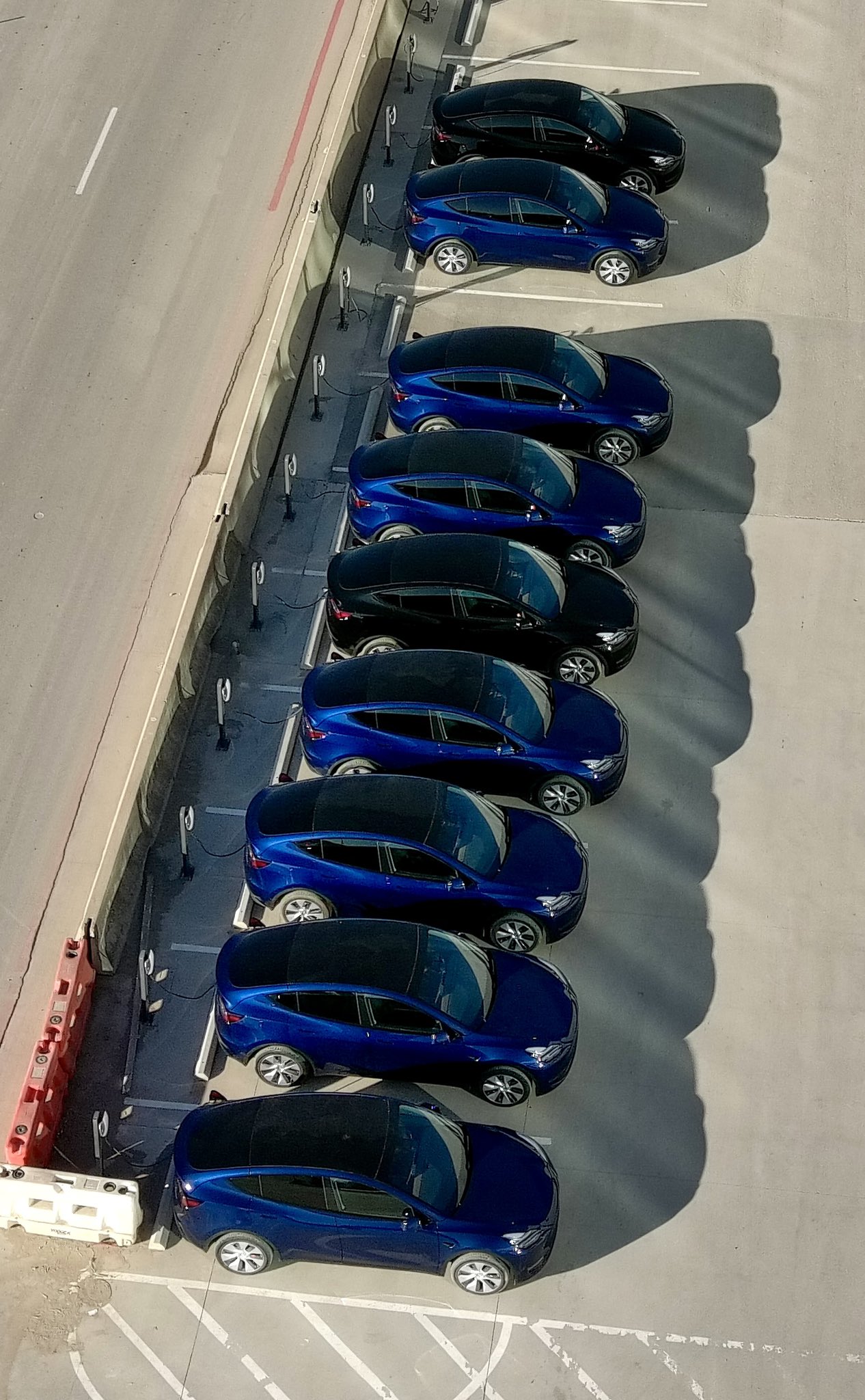 Capturado en Bridge por Drone por Jeff Roberts (@peterdog15.), se conectaron nueve Model Y a cargadores de destino en el estacionamiento de una fábrica.